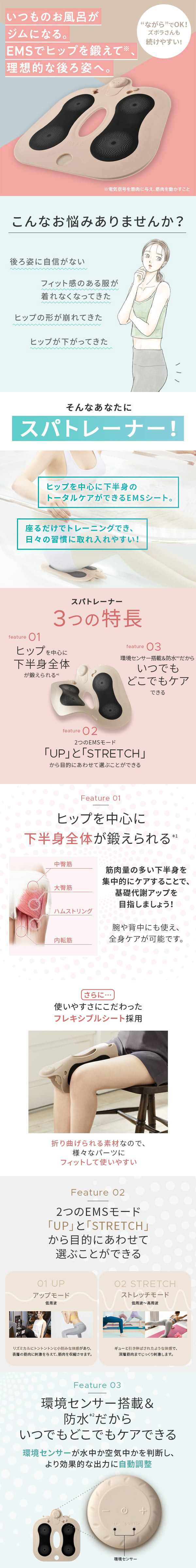環境センサー搭載なので、お部屋でもお風呂のなかでも使える優れモノ!いつでも好きな場所で好きな部位に、たった10分* 使うだけだから、日々の習慣にオススメです。