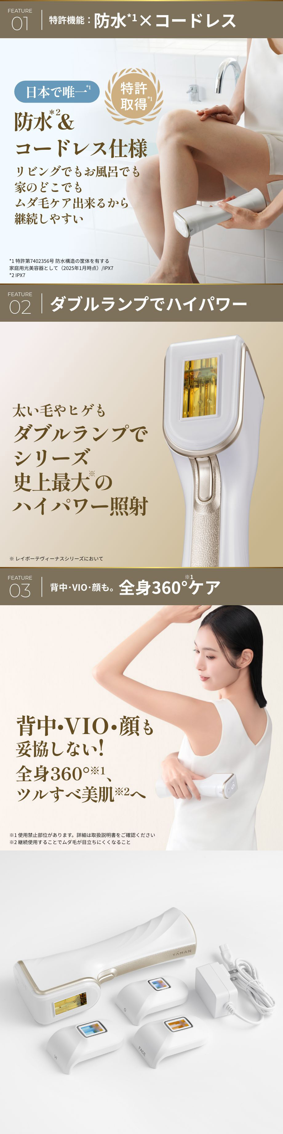 *1. 特許第7402356号 防水構造の筐体を有する家庭用光美容器として(2025年1月時点)/IPX7