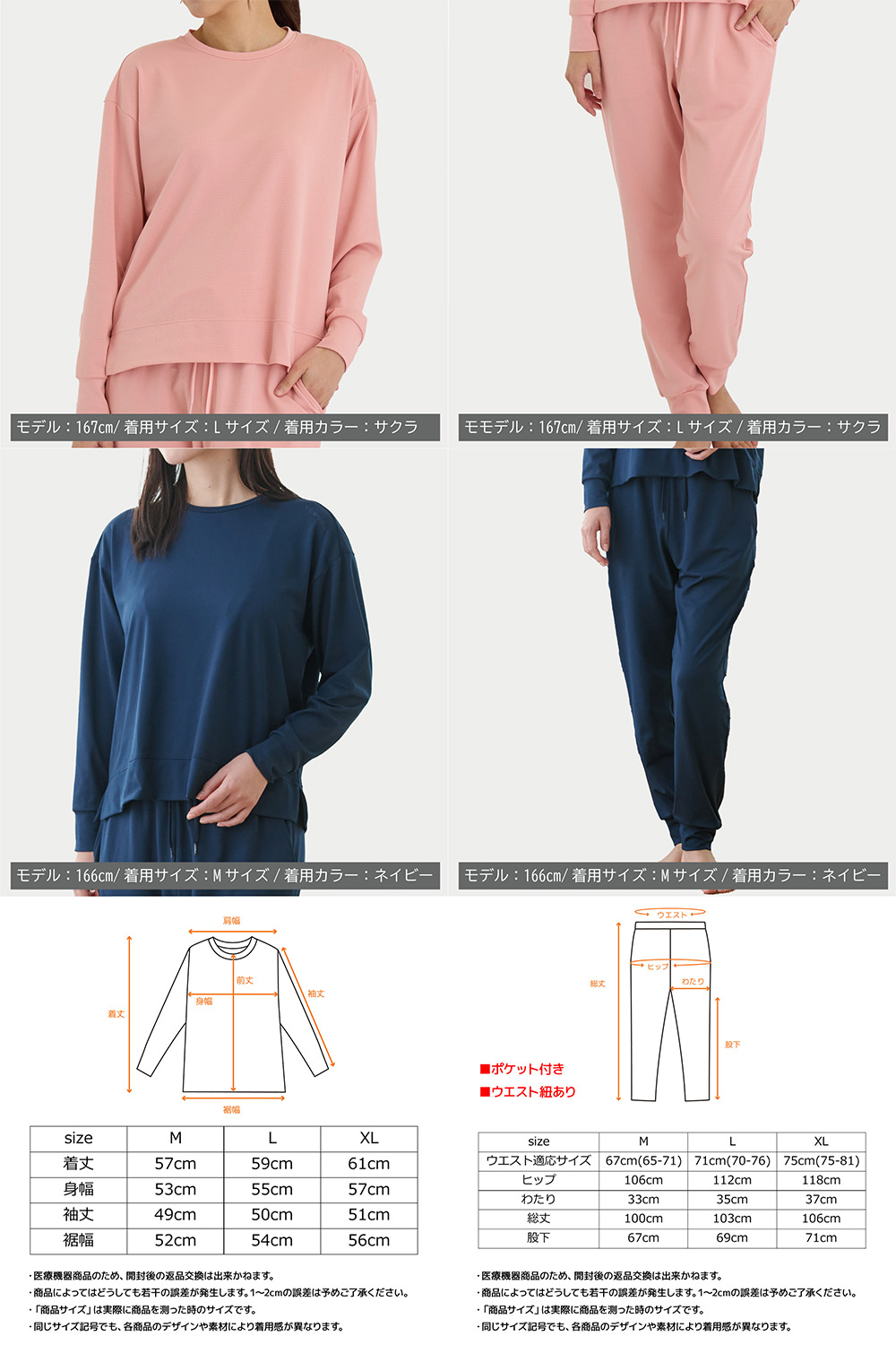 ソフトな糸を使用し、全方位に対して非常に高い伸縮性を兼ね備えたストレッチ生地は、リラックスタイムや寝返りをくり返す就寝時にも適しています。 - トップスはシンプルなクルーネック(丸首)タイプの長袖トップス。