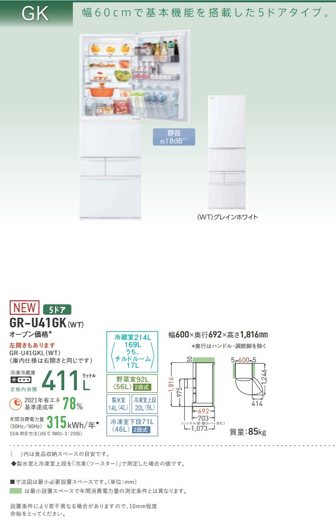 - 冷凍冷蔵庫 GR-U41GK(WT)(グレインホワイト) 定格内容積411L 5ドア(右開き)【カートン不良】
