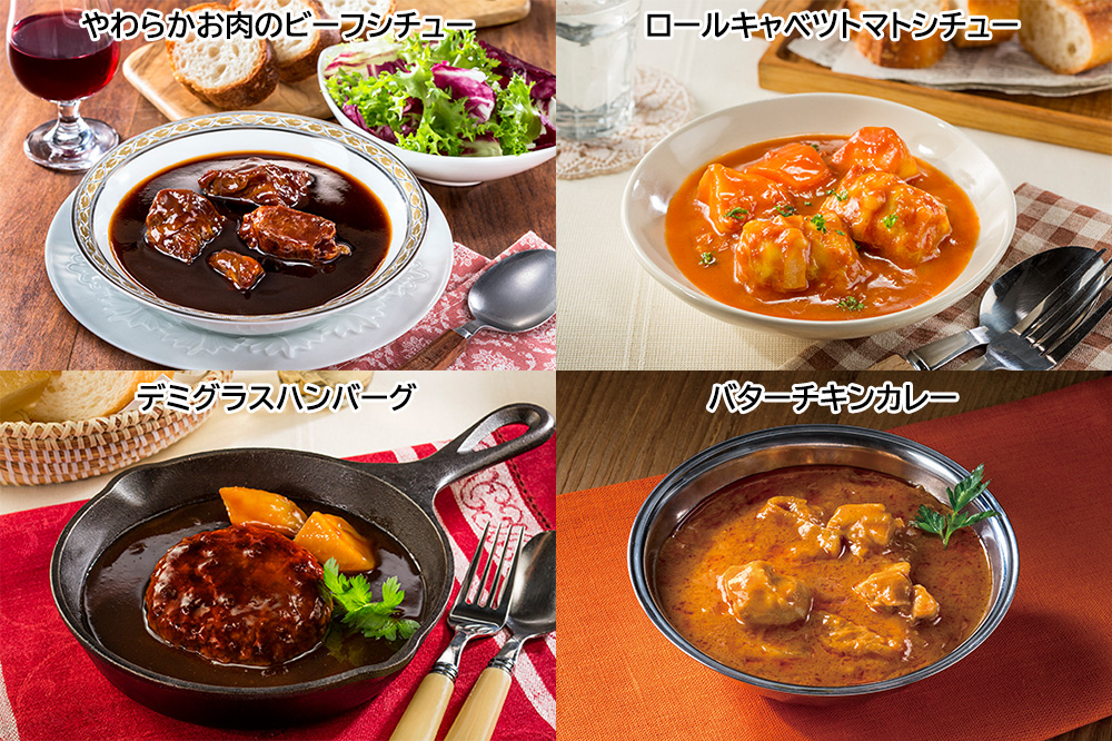 牛肉(アメリカ産)、デミグラスソース、デミグラスソースベース、たまねぎ、ワイン、植物油脂、ビーフシーズニングエキス、砂糖、トマトペースト、しょうゆ、にんじん、発酵調味料、調味酢、食塩、酵母エキス、デキストリン、たん白加水分解物、脱脂粉乳、乾燥卵白/増粘剤(加工でん粉、キサンタン)、カラメル色素、加工でん粉、調味料(アミノ酸等)、pH調整剤、香料、(一部に小麦・卵・乳成分・牛肉・大豆・鶏肉・豚肉を含む)
