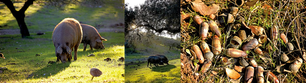 イベリコ豚の起源は、諸説ありますが紀元前3000年、当時イベリア半島に住んでいたケルト・イベリア人によってイベリコ豚の祖先が放牧されたことが始まりといわれています。イベリコ豚は、ポルトガルに近いスペイン北西部の小高い山地一帯、世界で唯一のコナラとコルクガシの天然の生態系「ラ・デエサ」と呼ばれる自然の牧草地で群れをなして生活しています。海抜700m以上、年間降水量が500mm以下、地中海性気候の乾燥が激しい環境です。この厳しい環境に適応するため、イベリコ豚は自らの成長スピードを遅くし、子豚の出産数を制限することで耐え忍んできました。同じイノシシを祖先に持つとはいえ、成長が早く、繁殖力が強いという一般的な豚とは、まったく異なる特徴を持ちます。過酷な環境で生き、広大な「ラ・デエサ」を餌を求めて歩き回るため、鼻が細長く、四肢が細く長いなど、原種に近い生態を保っています。家畜として改良されることなく、この世界でも類を見ない生態こそがイベリコ豚の最大の特徴です。イベリコ豚、特にイベリコ・デ・ベジョータ(ベジョータとはドングリの意)の飼育法の最大の特徴は、放牧にあります。コナラとコルクガシが生い茂る「ラ・デエサ」では、秋になるとドングリがたわわに実ります。東京ドーム63万個分と言われる「ラ・デエサ」を餌を求めて歩き回ります。その運動量は相当なもので、その運動量を支えるのが好物であるドングリです。この運動量とドングリがイベリコ豚の美味しさの決定的な違いを生み出します。運動により赤身が強く乳酸率が高い筋肉をつくり、熟成することで脂肪との親和性が高まり、バランスの良い味わいとなります。一方、ドングリには不飽和脂肪酸であるオレイン酸が多く含まれ、それを食べたイベリコ豚の脂肪にも必然的にオレイン酸の含有率も高くなります。オレイン酸はオリーブオイルの主要成分であることから、イベリコ豚は「足の生えたオリーブの木」と言われる所以です。オレイン酸には、善玉コレステロール(HDL)を増やし、逆に悪玉コレステロールの増加を防ぐという作用があります。特にイベリコ豚に含まれるオレイン酸は融点が低いため(人の体温と同じ37℃程度)、体内に脂肪が残りにくいと言われています。実際にイベリコ豚の脂を指で触っていると、体温で解け始めるのが分かります。一般的にイベリコ・ベジョータはオレイン酸含有量は57〜58%で、その年のどんぐりの出来により最低含有量を州政府が決めているそうです。