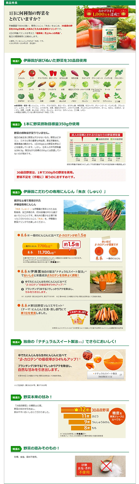 さらに今回は、30品目野菜に伊藤園独自のにんじん【朱衣】を配合して、さらに飲みやすく、おいしく仕上げました。(まろやかな味に仕上げ、後味さっぱり、切れのある甘さのある野菜ジュース)